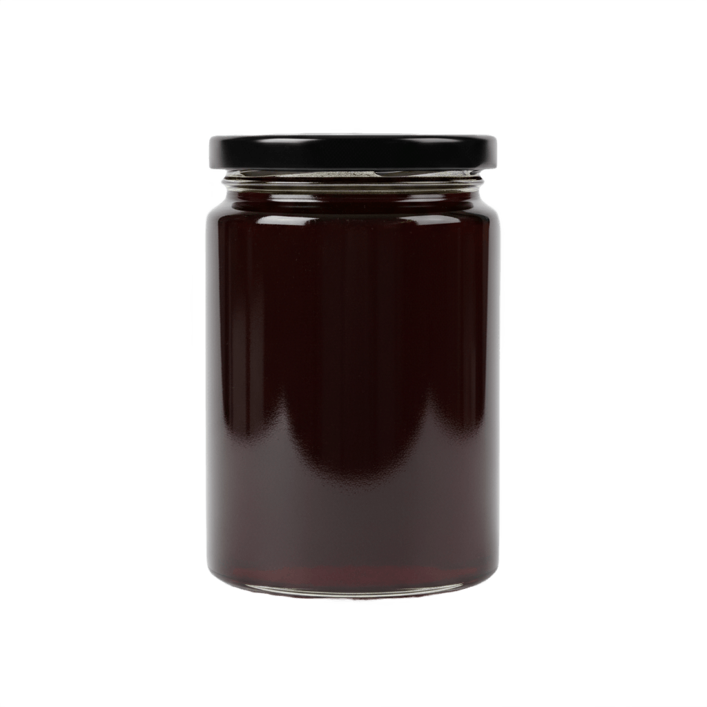 Very dark chestnut honey in an apothecary-style glass jar with black lid. Extremely dark reddish-brown, nearly black, thick and viscous. Ideal for gourmet food packaging and premium product visuals.
