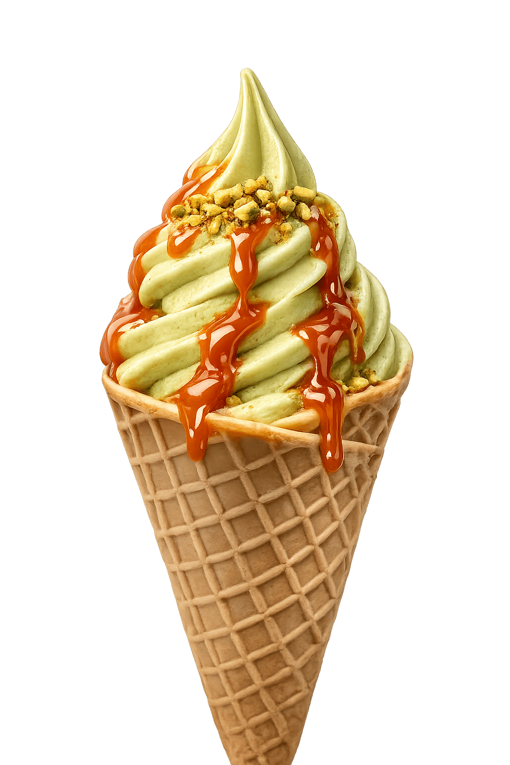 pistachio soft serve ice cream cone caramel drizzle transparent